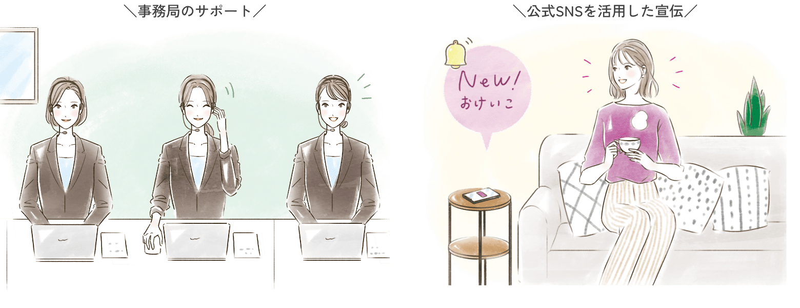 受講料は、おけいこタウンが先生に代わって集金し、まとめて先生の口座へお振込みします。キャンセル対応も行いますので、先生に集金の煩わしさはありません。また、おけいこタウンの公式SNSを活用した宣伝や各種イベント等、集客サポートも行います!